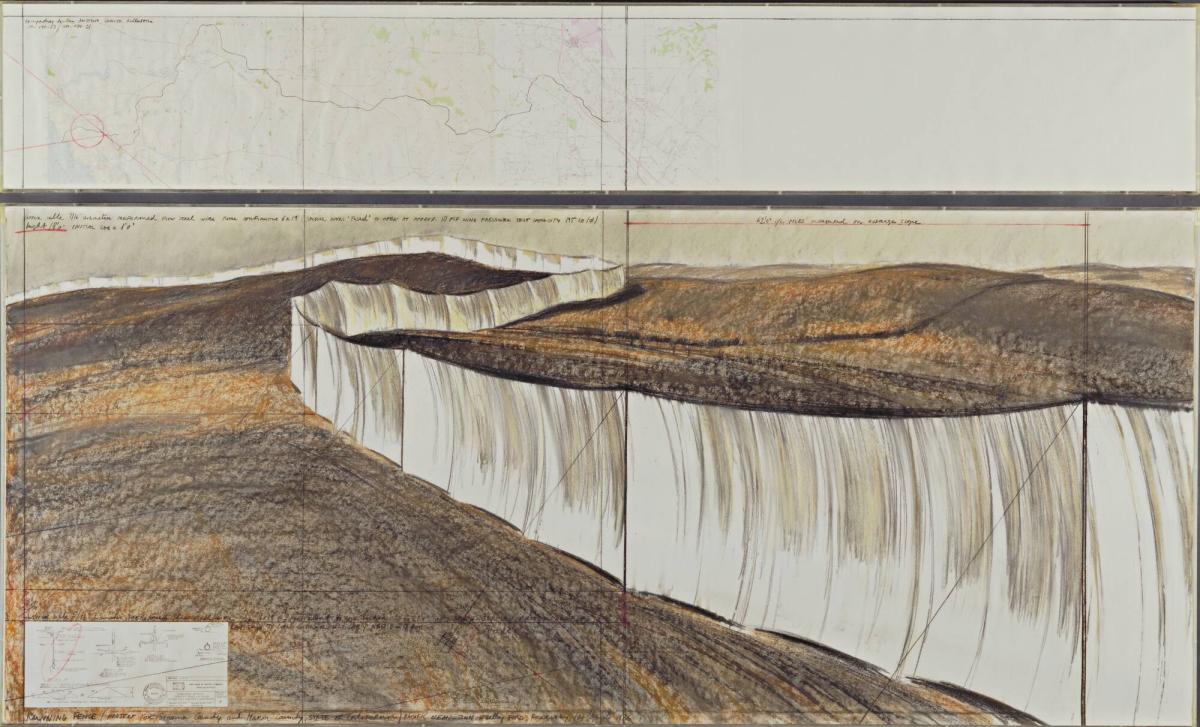 The AMAM's large two-part drawing was made in conjunction with Christo and Jeanne-Claude's Running Fence (1972-76), in which a white fabric curtain eighteen feet high ran for an amazing twenty-four-and- a-half miles from the northern California town of Cotati at Highway 101 to the Pacific Ocean at Bodega Bay. Completed on September 10, 1976, the temporary project was paid for through the sale of a variety of preparatory drawings like this one, collages, scale models, and lithographs.