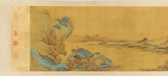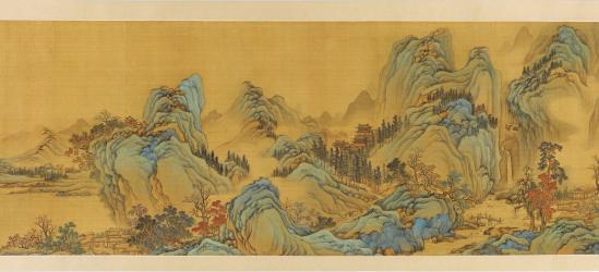 Not on viewThis handscroll invites us to visit a hidden world and may even lay out a perfect day of poetry, music, and companionship. From the right, meeting our waiting friend in a hut, we follow the trail around the first rocky peak and emerge in the foreground. The path takes us to a small compound, where two gentlemen await us and another guest who crosses the bridge below. His servant carries a wrapped musical instrument called a gǔqín 古琴, beloved by scholars. Further on, two servants carry our sumptuous lunch up a steep walkway to a temple in the hills. We wander until late afternoon, finding one more friend at his rustic residence. Finally, we board boats and float to a wine shop, marked by a pole and banner, where we end our day composing poems in a drinking game.