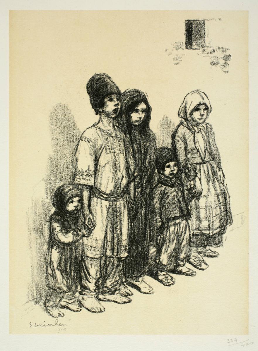 Not on viewBest known for his commercial illustrations, posters, and graphic design, Steinlen also produced work that commented on political and social situations, exposing his socialist ideologies. Earlier in his career, Steinlen designed works like the iconic "Chat Noir" poster, which were accessible to mass audiences. In the last years of his life, during the war, his posters and graphic works attempted to evoke sympathy for social causes, portraying subjects like evicted Belgians and ruined cities and homes. This lithograph, from the 1919 portfolio "Sketches of Wartime," depicts a group of ragged Serbian children huddled together, calling attention to the need for humanitarian aid in Eastern Europe.