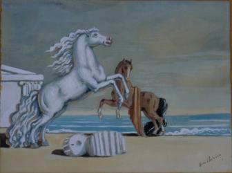 Not on viewDe Chirico, the originator of metaphysical painting, created this drawing during a period of transition in his career. Prior to the 1930s, his work paved the way for Surrealism. He explored themes such as nostalgia, enigma, and myth through disjointed spaces. After that decade, he turned to more conservative subjects, studying and copying the old masters and cultivating a neo-baroque style. This work, depicting two statue-like, rearing horses, is part of that transition. De Chirico's drawings and paintings of horses were very successful commercially, thus he drew and painted them prolifically throughout this period. Some dream-like qualities remain in this work: expansive space, disjointed perspective and scale, and the seeming plasticity of the stone ruins.