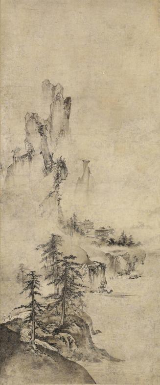 Not on viewThe tradition of ink monochrome landscape painting was brought from China to Japan by merchants and Buddhist monks in the thirteenth or fourteenth centuries. It was initially practiced by monk-painters active in the major Zen temples, but was also appreciated by the secular military elites who ruled Japan at that time. This Japanese scroll closely follows Chinese models. It depicts a mountainous landscape that is sharply defined in the foreground and becomes less distinct in the distance. Evidence of human civilization is visible but is dwarfed by the majestic natural forms. The composition is heavily weighted to one side, and large expanses of empty space give the image an evocative, lyrical quality. Indeed, the scroll belongs to a larger tradition of Chinese and Japanese paintings that were considered to be "poems without sound" and were intended to stimulate the viewer's imagination more than to portray a physical place.