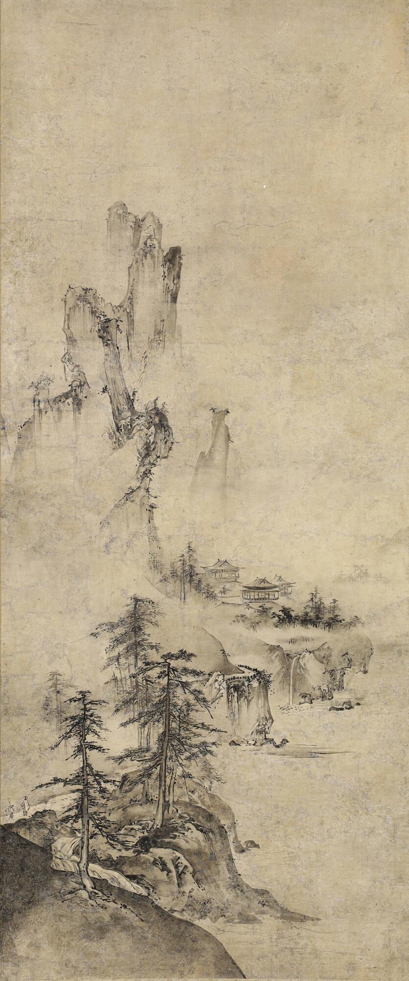 Not on viewThe tradition of ink monochrome landscape painting was brought from China to Japan by merchants and Buddhist monks in the thirteenth or fourteenth centuries. It was initially practiced by monk-painters active in the major Zen temples, but was also appreciated by the secular military elites who ruled Japan at that time. This Japanese scroll closely follows Chinese models. It depicts a mountainous landscape that is sharply defined in the foreground and becomes less distinct in the distance. Evidence of human civilization is visible but is dwarfed by the majestic natural forms. The composition is heavily weighted to one side, and large expanses of empty space give the image an evocative, lyrical quality. Indeed, the scroll belongs to a larger tradition of Chinese and Japanese paintings that were considered to be "poems without sound" and were intended to stimulate the viewer's imagination more than to portray a physical place.