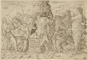 Not on viewLike many artists of his time, Andrea Mantegna was fascinated with ancient Greece and Rome, an interest that is reflected in the sculptural style that permeates the artist's œuvre. This print was likely executed after his move to Mantua, where he worked as the court painter to the Gonzaga family. The artist's first experiment with drypoint, this image depicts the burial of Jesus Christ in the tomb of Joseph of Arimathea. Christ's body, supported by a group of grief-stricken figures, droops horizontally across the left foreground, as Golgotha looms in the background. The positioning of St. John, who stands to the far right of the tomb with his hands clasped in the air, was adopted by Albrecht Dürer in an engraved Crucifixion scene of 1508.