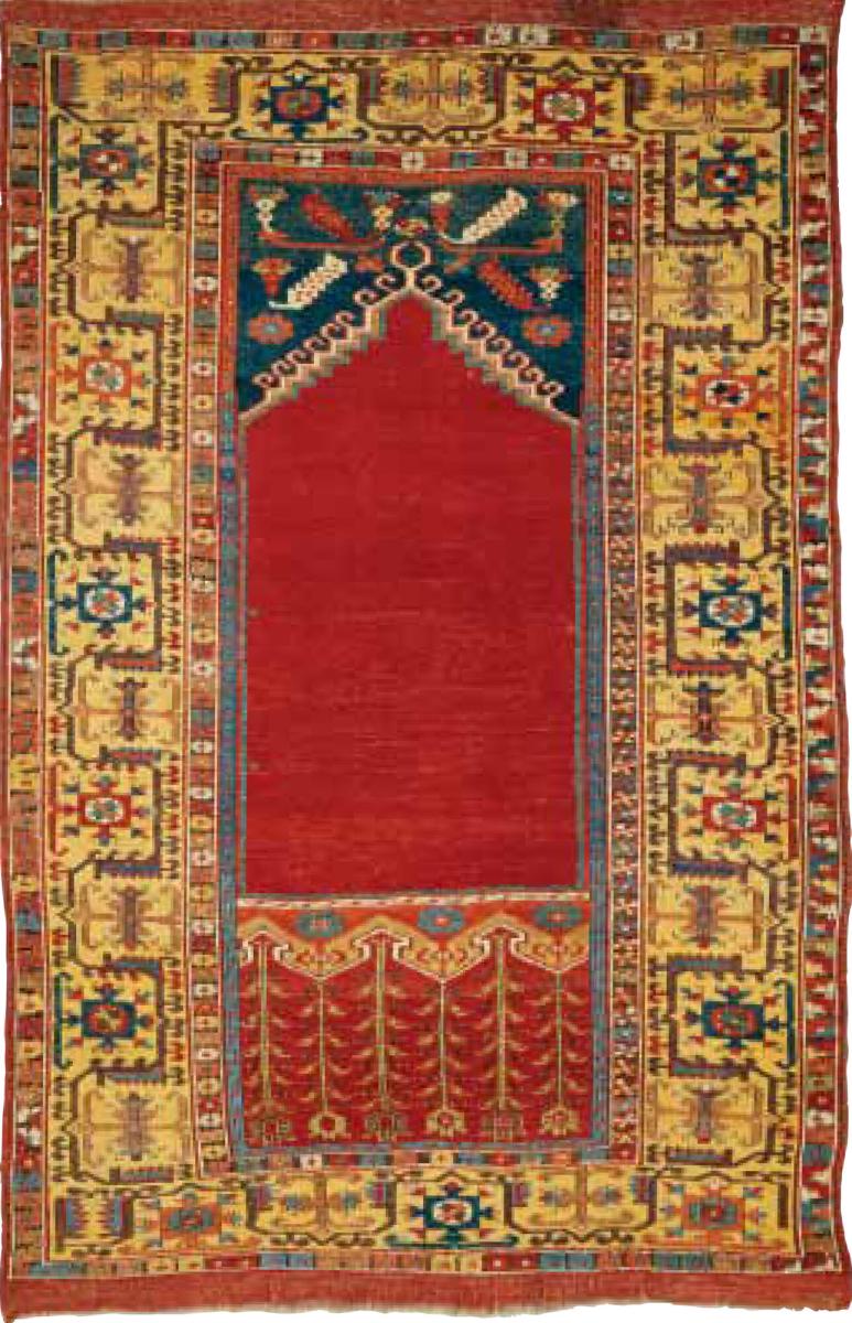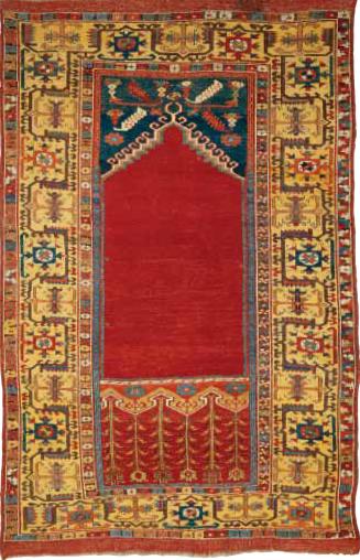 Prayer rugs were woven across the Islamic world in many different regional variations. This rug was produced in the Turkish village of Ladik, located in central Turkey not far from the town of Konya, a major weaving center from as early as the fourteenth century. Ladik rugs often feature stylized images of tulips, the emblematic flower of the Ottoman Turks who ruled Turkey between the sixteenth and early twentieth centuries. These rugs are also known for the clarity and brilliance of their red and yellow dyes, both of which are used to great effect in this rug.