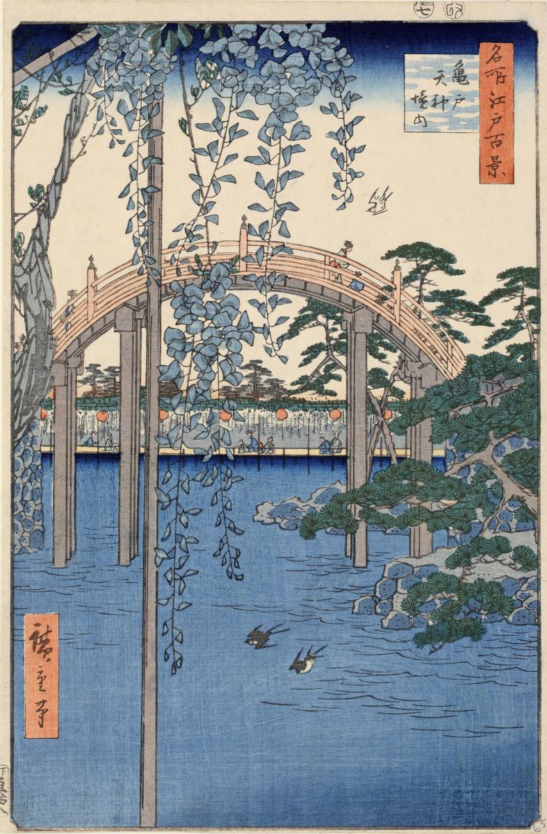 In the Precincts of the Tenjin Shrine at Kameido (Kameido Tenjin keidai), from the series One Hundred Famous Views of Edo (Meisho Edo hyakkei)