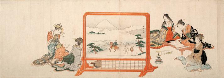 On the screen is another member, Ariwara no Narihira 在原業平, in a famous scene from the Tales of Ise (Ise monogatari 伊勢物語) where the poet sees Mt. Fuji and composes a poem. The six figures in the print, then, are probably to be taken as the Six Immortal Poets, with the one covered by the screen a stand-in for Narihira.