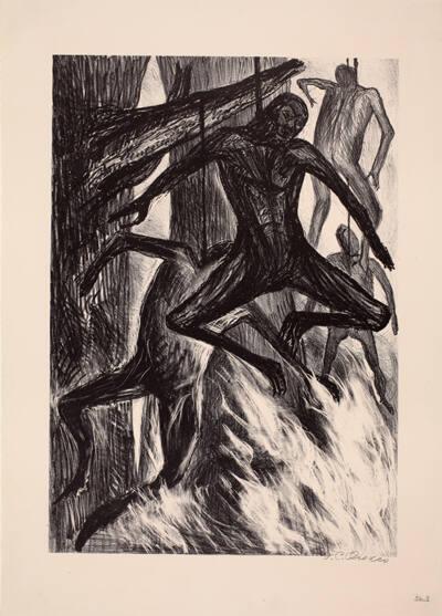 Not on viewJosé Clemente Orozco originally created Negroes to be shown at two competing 1935 exhibitions (sponsored by the NAACP and the Communist Party-affiliated John Reed Club) organized to provide an artistic commentary on the practice of lynching. He was inspired by a famous 1930 photograph of the charred body of George Hughes, a Texan agricultural laborer, lynched by a white mob after being falsely accused of rape and murder. The contorted pose of the figure in the foreground mirrors that of Hughes in the photograph, originally published in the Labor Defender. Diego Rivera declined the NAACP's request for a submission, dissuaded by the organization's more centrist politics. Ultimately, Orozco was one of only five artists whose work appeared in both exhibitions.