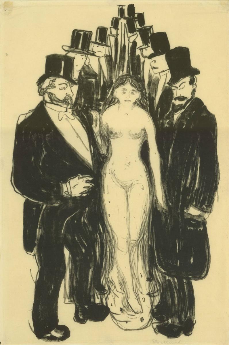 One of Munch's earliest lithographs, The Alley highlights the artist's experimentation in graphic art after being formally trained as a painter. The angst, psychological distress, and highly charged sexual tension of Munch's works are replicated here-a woman walks naked and alone through a sea of men clothed in formal suits and hats, who stare shamelessly as they part the way for her. The men can be construed as either the victims of sexual desire, or the perpetrators. This ambivalence towards women and sexuality was a recurring theme throughout Munch's lifetime.