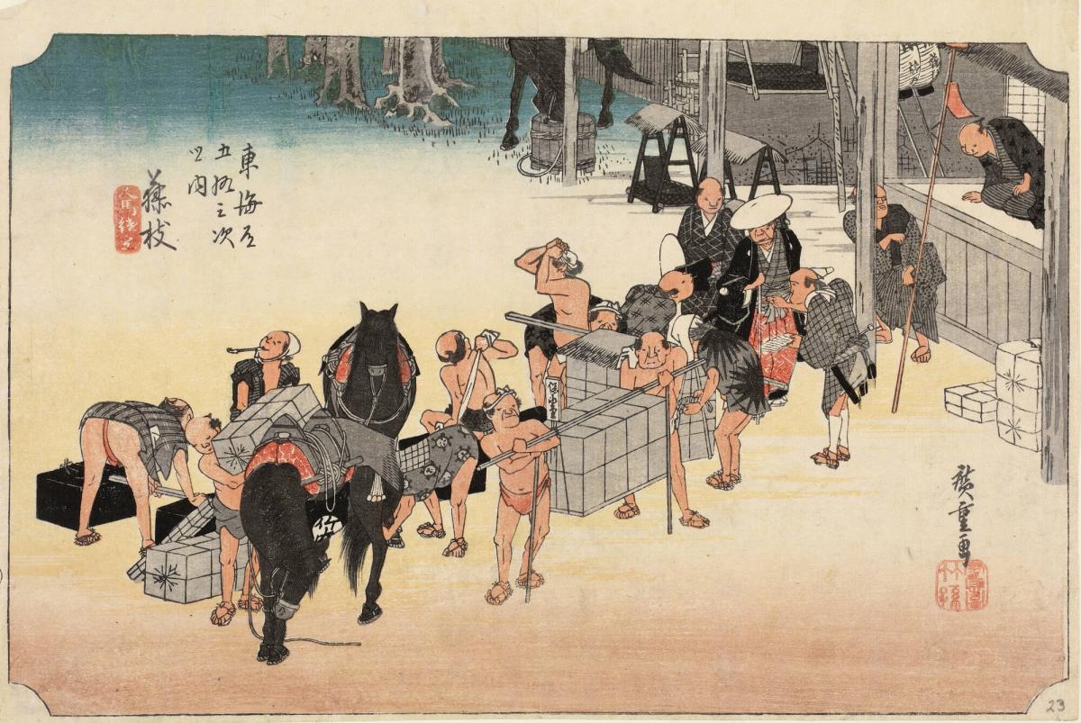 Changing Porters and Horses at Fujieda, no. 23 from the series Fifty-three Stations of the Tōkaidō