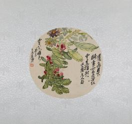 Not on viewBlossoms seem to burst out of their surrounding leaves, their supporting branches curving to follow the circular shape of the fan. This creates space on the right for the artist’s inscription, which references a couple riding into the red clouds of the heavens on a phoenix. Are the red blossoms the clouds, and the purple flower at the top a phoenix? With his lively brushwork and bold use of color, Wú Chāngshuò’s expressive flower and bird paintings were particularly popular in Shanghai’s art market at a time of rising commercial culture in the city. A leading figure in the Shanghai School, Wú was initially known for his seal carving and calligraphy, and did not begin his career as a professional painter until his middle age.