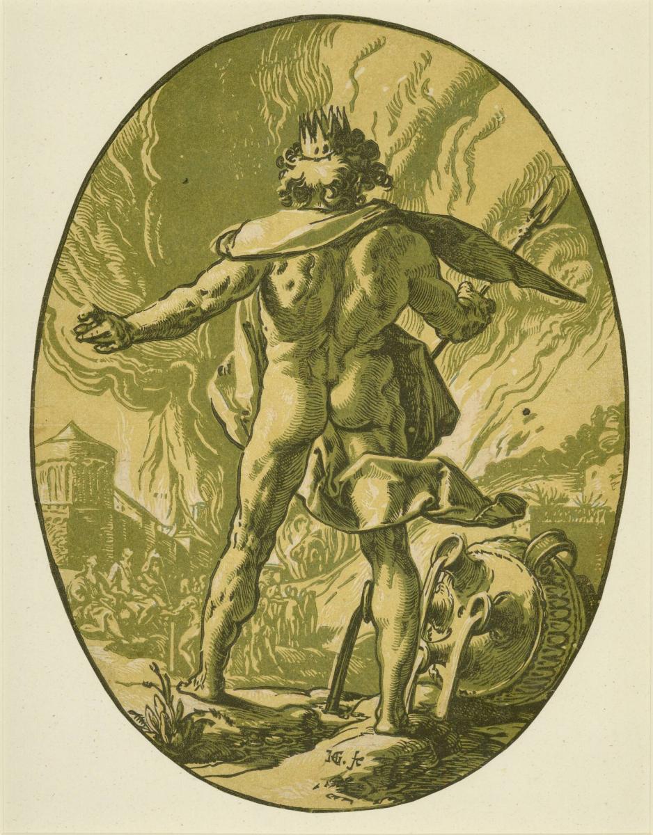Not on viewPluto, ruler of the underworld in ancient Greco-Roman mythology, appears here as a muscle-bound giant overseeing his fiery realm. Figures in the distance are souls being judged and the urn at right stands for the four rivers of Hades. Goltzius’s monumental presentation of the god from behind draws upon his intensive study of ancient sculpture that had been excavated and exhibited recently in Rome, particularly the Farnese Hercules, which likely was a model for Pluto’s powerful physique. Goltzius created this chiaroscuro print in several different color combinations, using a separate woodblock for each color. The green and yellowish tones in this example add sharpness to the design and heighten the visual effect of the formidable subject.