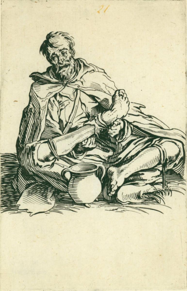 Callot’s series is noteworthy for the variation of poses, ragged costumes, and sorrowful expressions. Although some of the beggars could be feigning their discomfort, most do not appear to do so. Their wasted bodies and world-weary expressions communicate the sorrows of 17th-century penury.