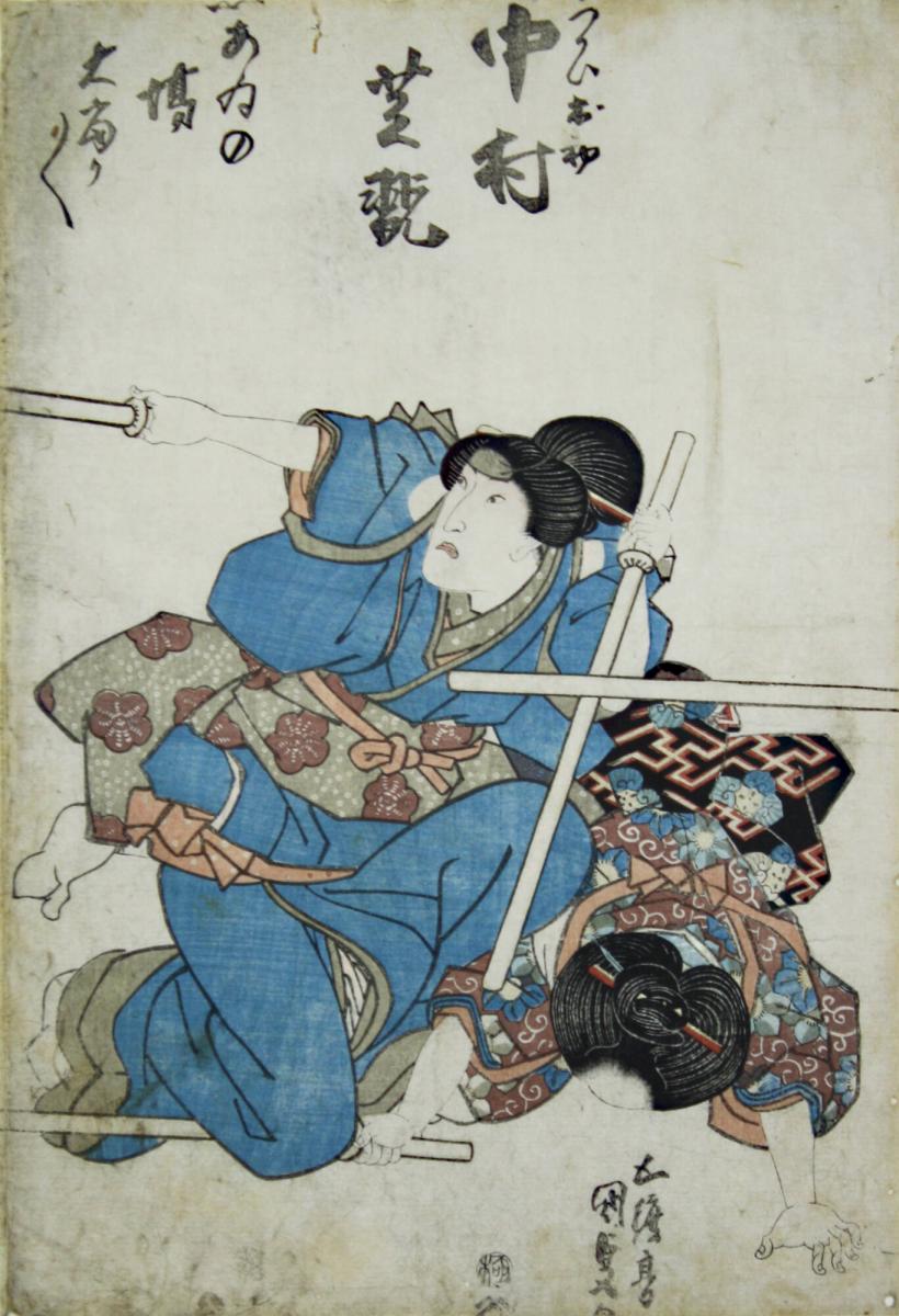 The actor Nakamura Shikan as Ohatsu dueling with wooden swords