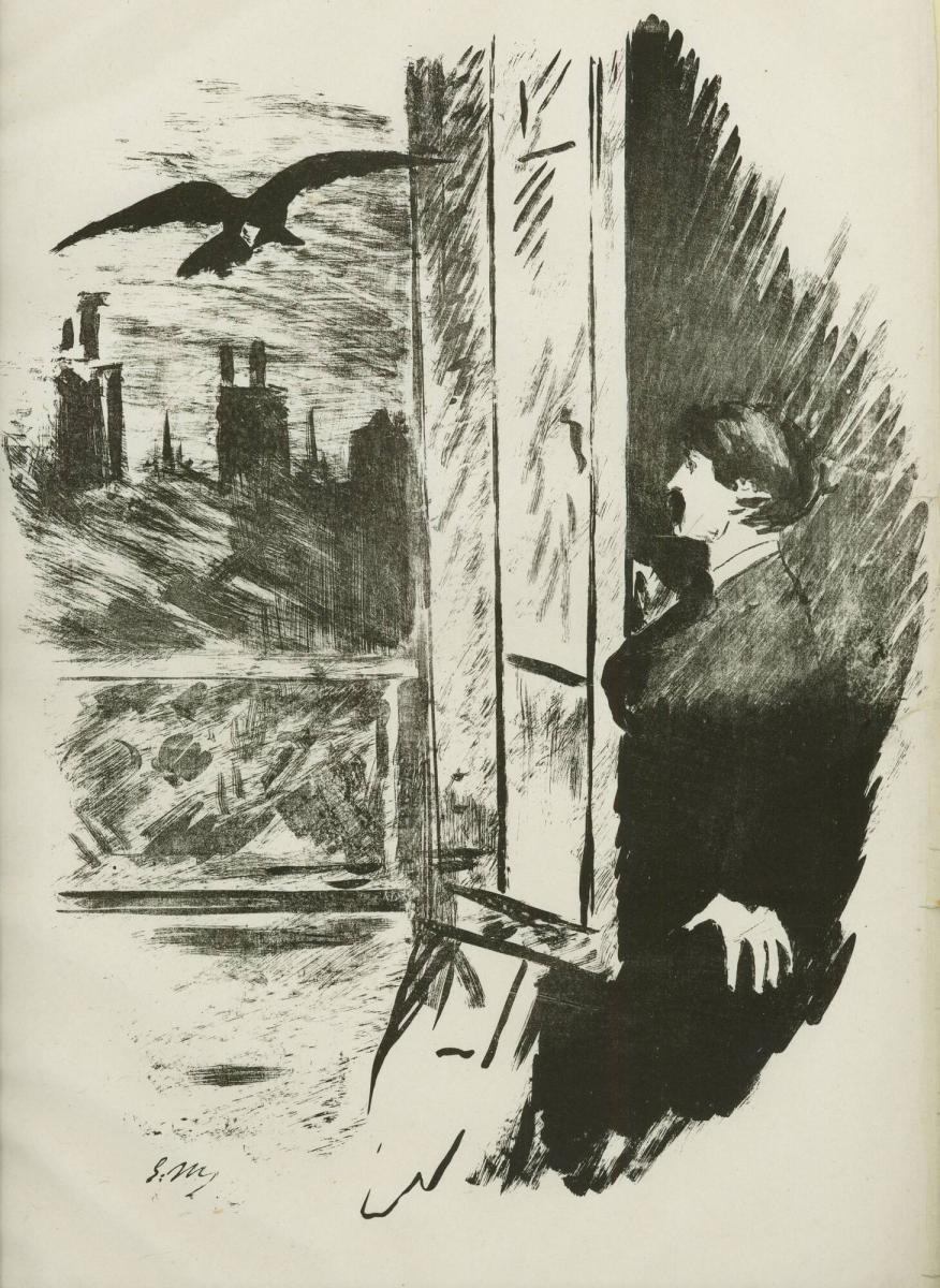 In 1875, poet Stéphane Mallarmé published Le Corbeau, his French translation of Edgar Allan Poe’s “The Raven.” Mallarmé asked his artist-friend Edouard Manet to provide illustrations for the limited edition publication, which sold for a mere 25 francs. Manet complied with a series of five lithographs which presented four crucial moments in the narrative, as well as an ex libris (bookplate). The dark, sketchy atmosphere of Manet’s compositions mirrors the foreboding tenor of Poe’s poem, which tells of a heartbroken lover tormented by the midnight intrusion of a talking raven in his chamber. One of Poe’s best-known works, the tale of the raven who quothed “Nevermore” has been a popular source for other artist-illustrators, including Gustave Doré, John Tenniel, and James Carling.