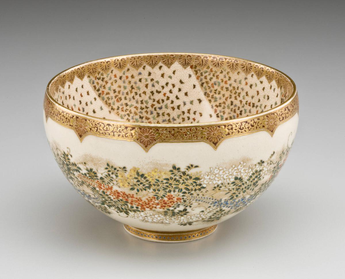 Named for a superficial resemblance to an earlier type of ceramic produced in the region of Satsuma on Kyushu Island, Meiji Satsuma wares featured earthenware bodies that were covered with a thick ivory glaze and lavishly decorated with colored enamels and gold. The best examples were painted with extraordinarily fine designs; in some cases, the artists used single-hair brushes and jeweler's glasses to create their delicate images. The clouds of tiny butterflies on the interior of this bowl would have required just such a painstaking technique. The bowl was painted by a Tokyo-based artist named Itô Tôzan, who had initially studied conventional brush painting before becoming a ceramic decorator in the 1880s. His Satsuma wares won prizes at international exhibitions in Paris, Chicago, and Amsterdam in the 1890s and early 1900s. In 1917, he was made a member of the prestigious Imperial Art Academy in Tokyo. One of his sons also became a noted ceramic painter.