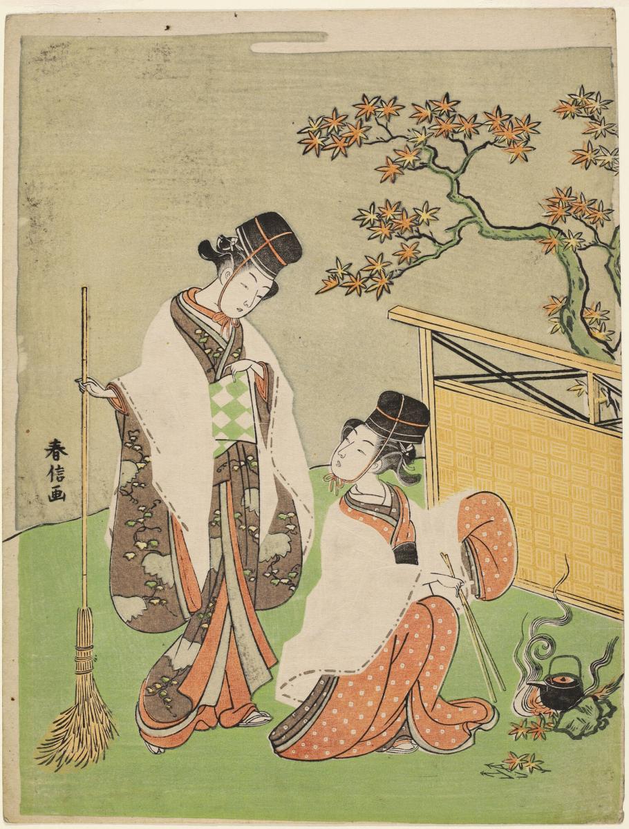 Two Women Dressed as Court Workmen, Heating Sake on a Fire of Maple Leaves