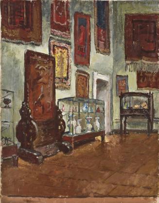 Not on viewAn accomplished watercolorist and printmaker, Paul Arnold graduated from Oberlin with a B.A. in 1940 and an M.A. in 1941, and began teaching at the college in 1942. While he was still an undergraduate, Arnold painted a series of watercolors of the Allen’s galleries and its director’s office. This rendering of a gallery then dedicated to Asian art has a lively, sketch-like quality, but captures enough detail that the objects on view, which include a Chinese wooden cabinet and Persian and Turkish rugs, can still be identified. Arnold had a particular interest in Asian art, having been born and raised in China, where his father was a general secretary for the YMCA. Arnold was drafted into service in World War II and eventually returned to China to conduct intelligence work with the U.S. military; he was discharged in 1946 and resumed his position at Oberlin, becoming a full professor and department chair. He gave his early watercolors of the Allen’s galleries to the museum in 1985, the year he retired after four decades of teaching.
