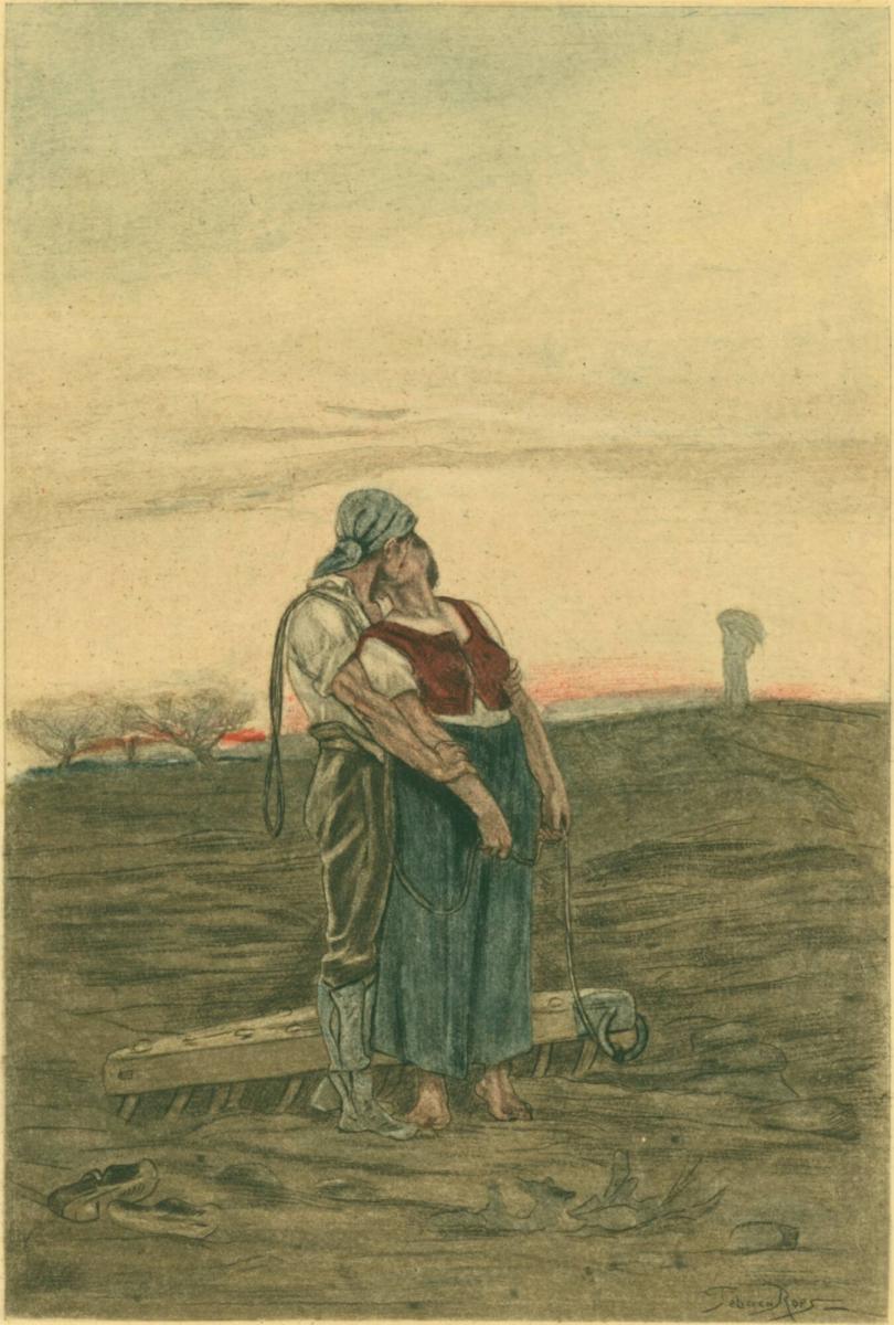 Two farmers embrace in the midst of a barren field. More than a gesture of intimacy, their kiss is presented as a passionate, all-consuming expression of love. The couple’s unabashed performance of romance, here rendered inseparable from the act of labor, reinforces the idealized notion of agrarianism present throughout the 19th century.