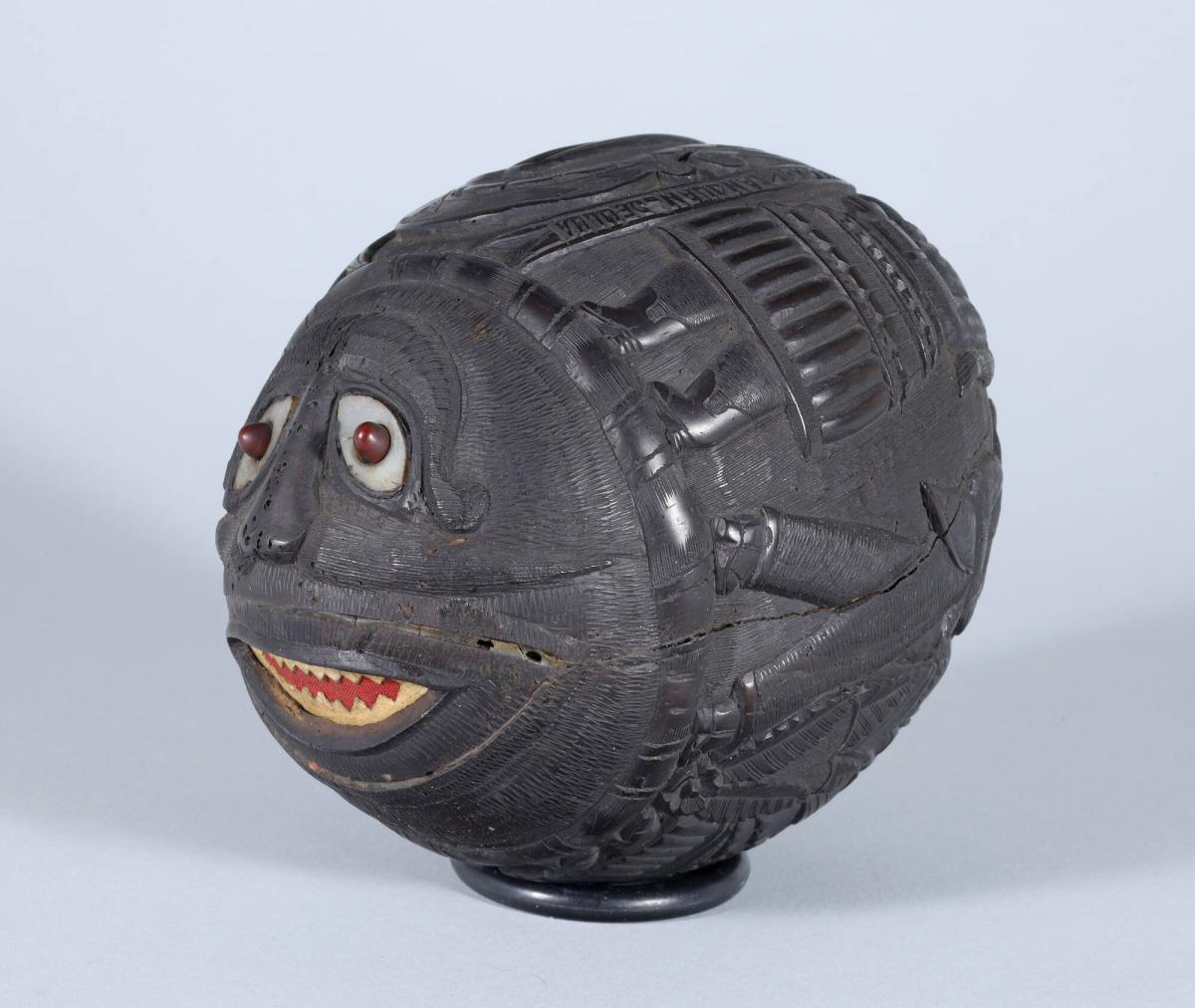 Carved Coconut Bank with Figures and a Face