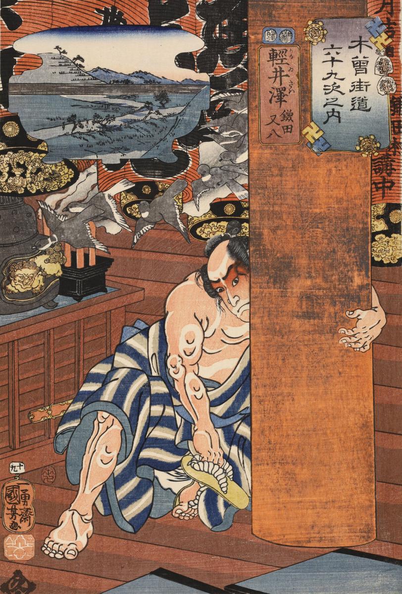 Karuizawa: Kamada Matahachi Placing a Sandal under a Temple Column, no. 19 from the series The Sixty-nine Stations of the Kisokaidō