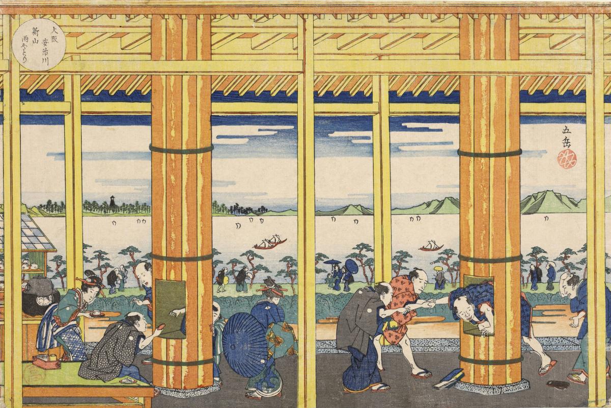 Sheltering from Rain at the New Mountain by the Aji River in Osaka, from the series Views of Mt. Tempo
