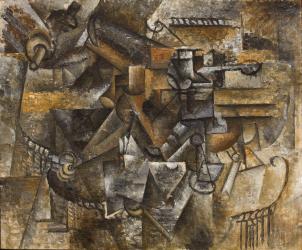 Not on viewGlass of Absinthe, which shows a small glass of liquid on a café table, was painted in 1911 during Picasso's Cubist period. In the painting, flat planes of ochres, browns, and blacks slip one on top of each other, creating enigmatic forms, and it is not readily apparent where the glass of greenish liquid is, nor on what it rests. By this point in Picasso's development, objects depicted no longer had to make physical reference to real things, and could be reconfigured and composed in the eye of the beholder.