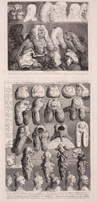 Hogarth's tongue-in-cheek study of wigs links the eighteenth-century rage for Vitruvius, which would deduce laws of composition and canons of beauty from the measure of ancient columns or statues, with the outlandish hairdos affected by fashionable society. The periwigs are arranged in various "orders": Episcopal, Old Peerian or Aldermanic (worn by peers and city officials), Lexonic (lawyers), Composite or Half Natural, and Queerinthian or Queue de Renard (Corinthian, the most elaborate, worn by consummate dandies).