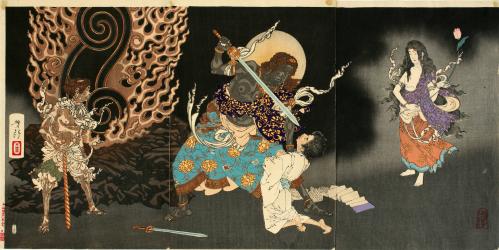 In Yoshitoshi’s dramatic triptych, the young priest Yūten kneels as if in prayer, the sutras scattered on the floor near him. The statue of Fudō Myōō, flanked by his attendants, seems to have just come alive and stepped down from the altar, leaving behind his flaming backdrop. He holds his sword of wisdom as if about to thrust it into Yūten’s mouth.