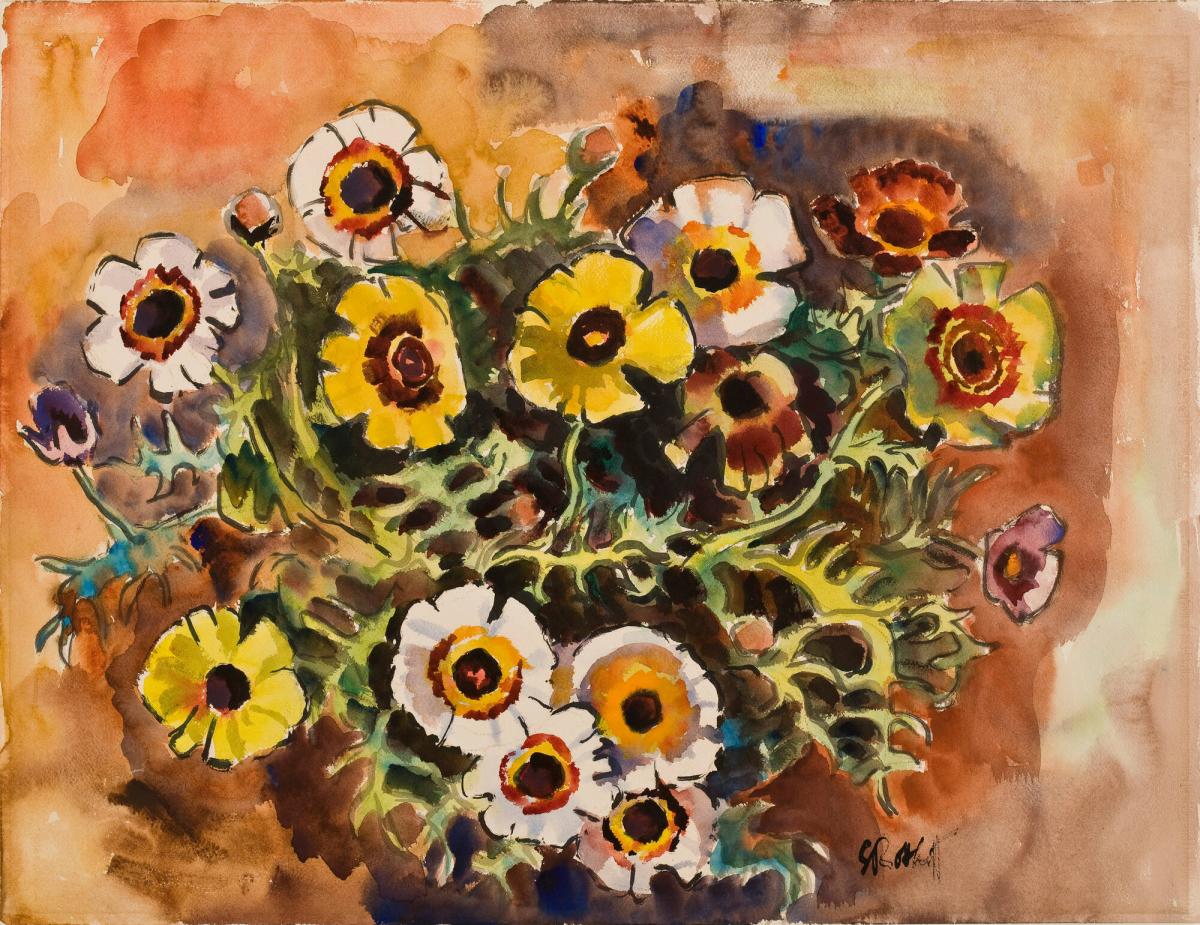 Not on viewSchmidt-Rottluff was a founder of the artist group Die Brücke, which was closely associated with the development of Expressionism. Other members included Kirchner and Pechstein, whose works are also featured in this exhibition. The influence of artists such as Van Gogh, Matisse, and the group known as the Fauves can be seen in this work, while the intense color and free composition, in which the flowers seem to spring from nowhere, is characteristic of the artist's later period. Schmidt-Rottluff's work was eventually deemed "degenerate" by the Nazis and his pieces were seized from German museums and galleries.