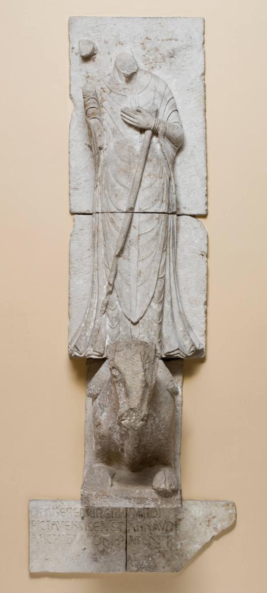 On viewThese sculptural reliefs (AMAM 1948.1 & 2) of two bishops, each holding a crozier and making a sign of blessing, are from the Benedictine Abbey church at Les Moreaux (near the communes of Champagné-Saint-Hilaire and Sommières-du-Clain, south of Poitiers, France). They were still in situ in 1921 when they were photographed by Arthur Kingsley Porter, the expert on Romanesque sculpture, on the west front of the ruined church. The sculptures remained there until they were sold in 1931-32 with the assent of the French ministry of Fine Arts after the church had been delisted as a historical monument. The abbey, then overgrown with ivy, had been devastated during the Hundred Years' War and the Wars of Religion, and by the nineteenth century was already in ruins.