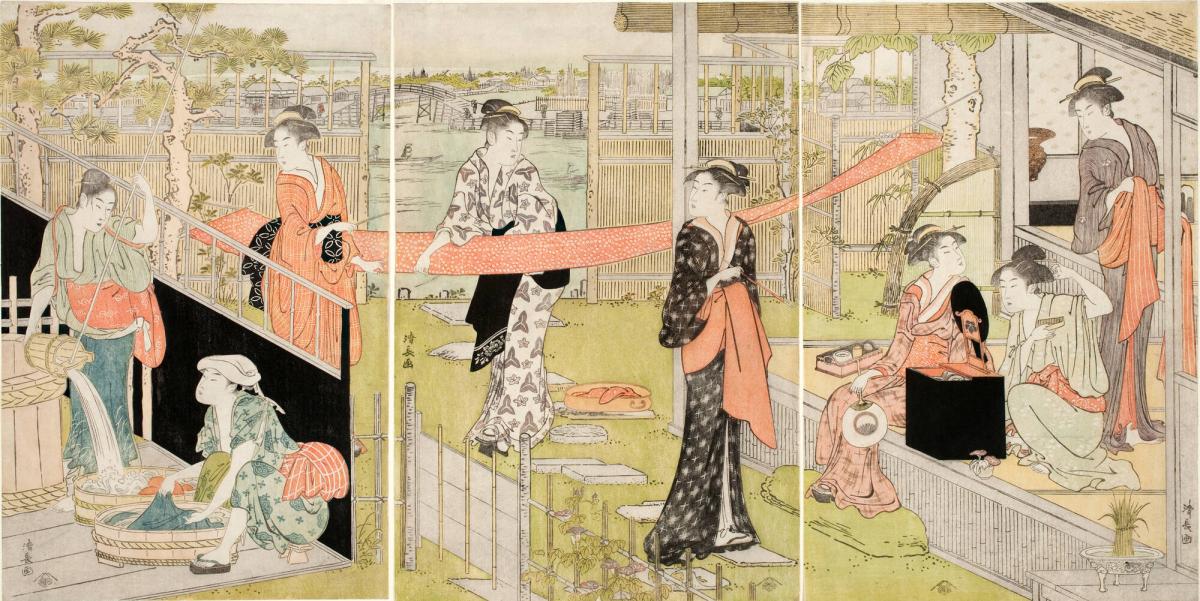 Women Washing and Drying Lengths of Cloth in a Garden beside the Sumida River