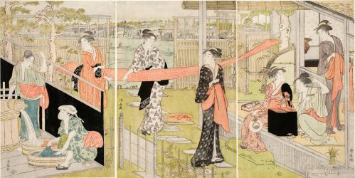 Not on viewThis triptych (three sheet print) shows women washing and drying clothes, fixing their hair, smoking a pipe, and otherwise relaxing in a private garden setting. A departure from more formal bijinga subjects, these domestic scenes gained great popularity in the last decades of the 18th century.