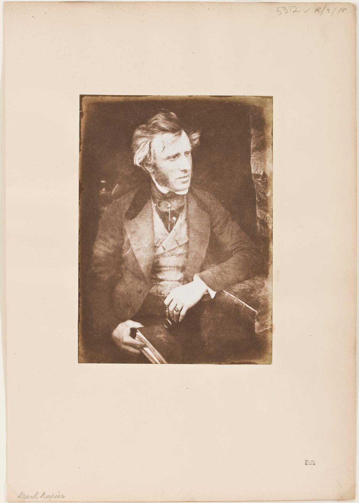 Hill and Adamson's portrait captures the lively personality of Mark Napier (1798- 1879), a lawyer who became deputy sheriff of Dumfriesshire. Napier was a member of Edinburgh's Calotype Club and shared in the widespread enthusiasm and fascination for this newly developed medium. At least five different images of Napier made by Hill and Adamson exist, all of which show the rich brown tones characteristic of salt prints. Photographed in the artists' studio garden at Rock House, Napier is shown seated surrounded by large folios of the plays of Francis Beaumont and John Fletcher, English dramatists from the early seventeenth century, and J. M. W. Turner's collection of prints, Liber Studiorum. The carefully posed sitter references well-established British portrait-painting traditions and captures Napier's likeness with refreshing immediacy and directness.