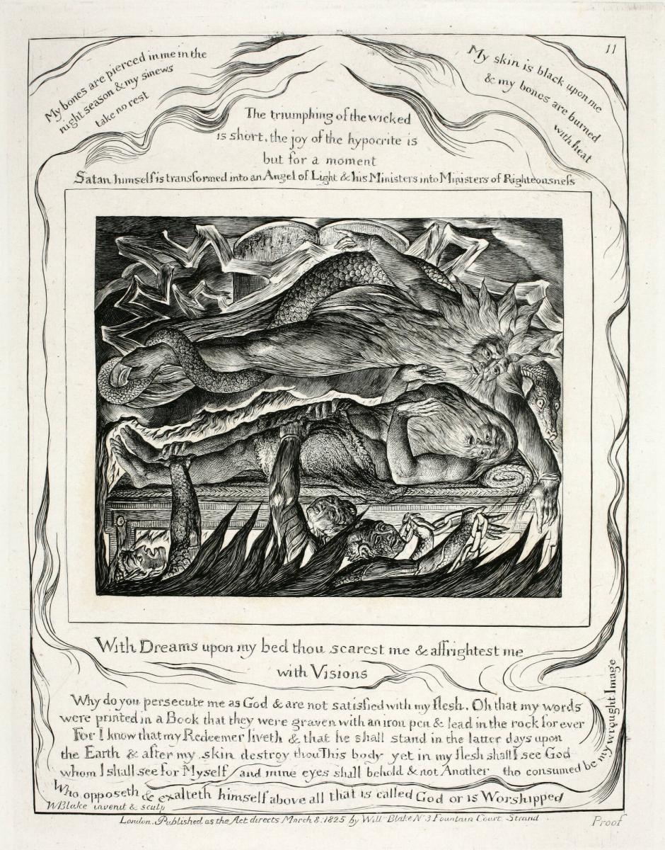Not on viewPainter, poet and engraver, William Blake was an eccentric visionary and ardent nonconformist known for his mystical themes and innovative forms. His agile and elongated figures, influenced by Gothic sculpture and Michelangelo, are often pictured floating in a non-material world, adorned with symbols from his complex personal mythology. Blake's Book of Job integrates image and design with biblical texts that reconstruct the Old Testament in New Testament terms. The Job narrative, in which Satan tortures the upright Everyman in a test of faith, mirrors Blake's own artistic vision. Blake was deeply opposed to academic art, and in his interpretation of the tale Job is transformed from despair to redemption through a spiritual belief in the power of individual imagination.