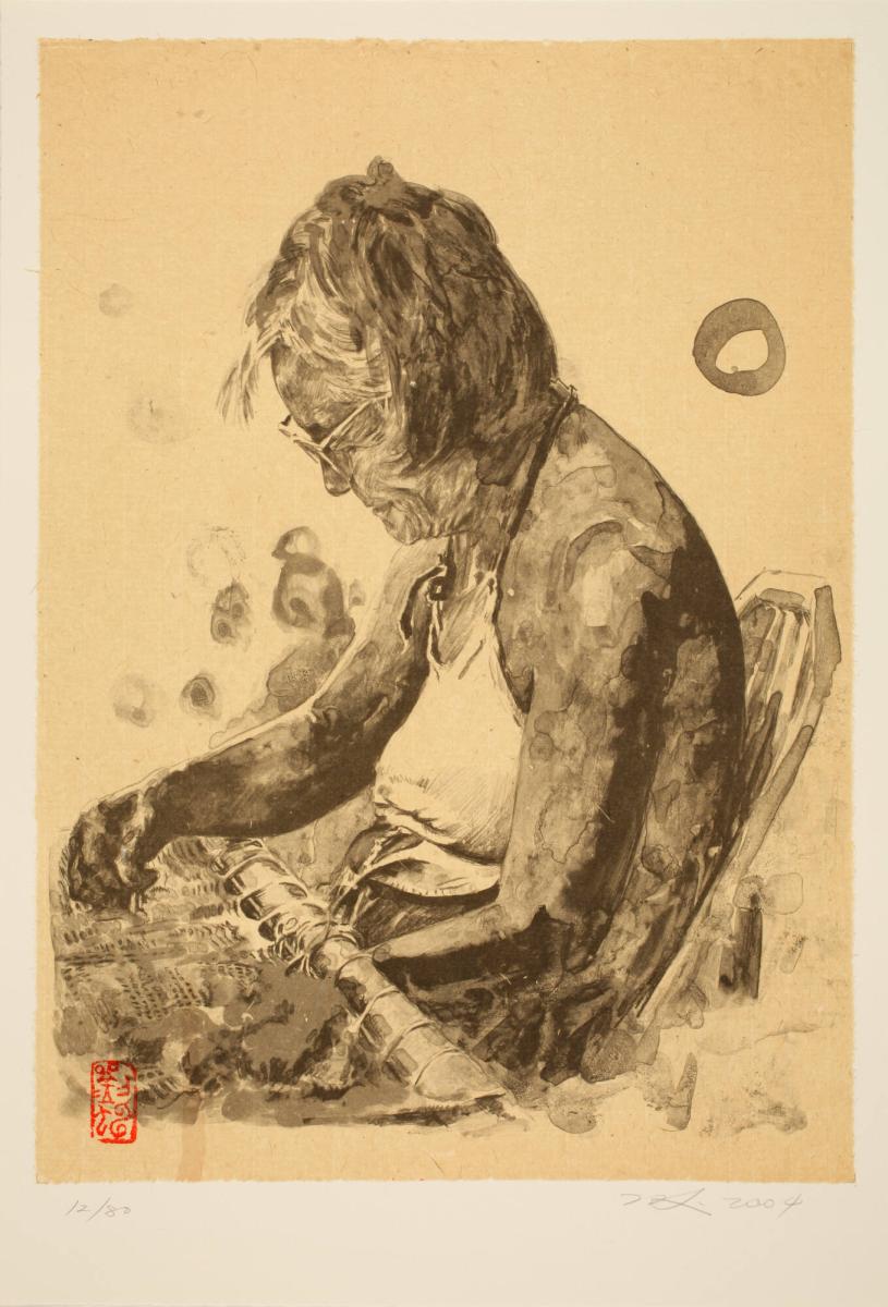 Contemporary artist Hung Liu began her career in China but moved to the United States in 1984. This image of an old woman absorbed in her sewing, like much of Liu’s work, explores the experiences of Chinese and Chinese-American women. The medium she chose—lithography—allowed her to draw or paint her design in a greasy material that attracted ink. The technique is suited to creating blurs and drips similar to those in her oil paintings, three of which are in the AMAM collection. The circles in the background reference the Zen enso (a circular symbol of enlightenment more closely associated with Japanese art) and reflect Liu’s interest in Buddhism.