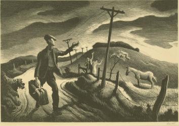 Not on viewAlong with Grant Wood, Benton was a major American Regionalist artist. Benton extolled the virtues of rural America through images of daily life in the Midwest, often in conscious opposition to the modern developments occurring in major urban centers. This print functioned as a study for a painting of the same subject (now in a private collection), and the artist noted that it represents an “Ozark boy setting out from home, to go to school or to find work. The folks and his horse say goodbye.” Increasing mechanization of American industry during the postwar years demanded large work forces, and many rural communities witnessed their young men leaving the family farms to seek their fortune in the cities.