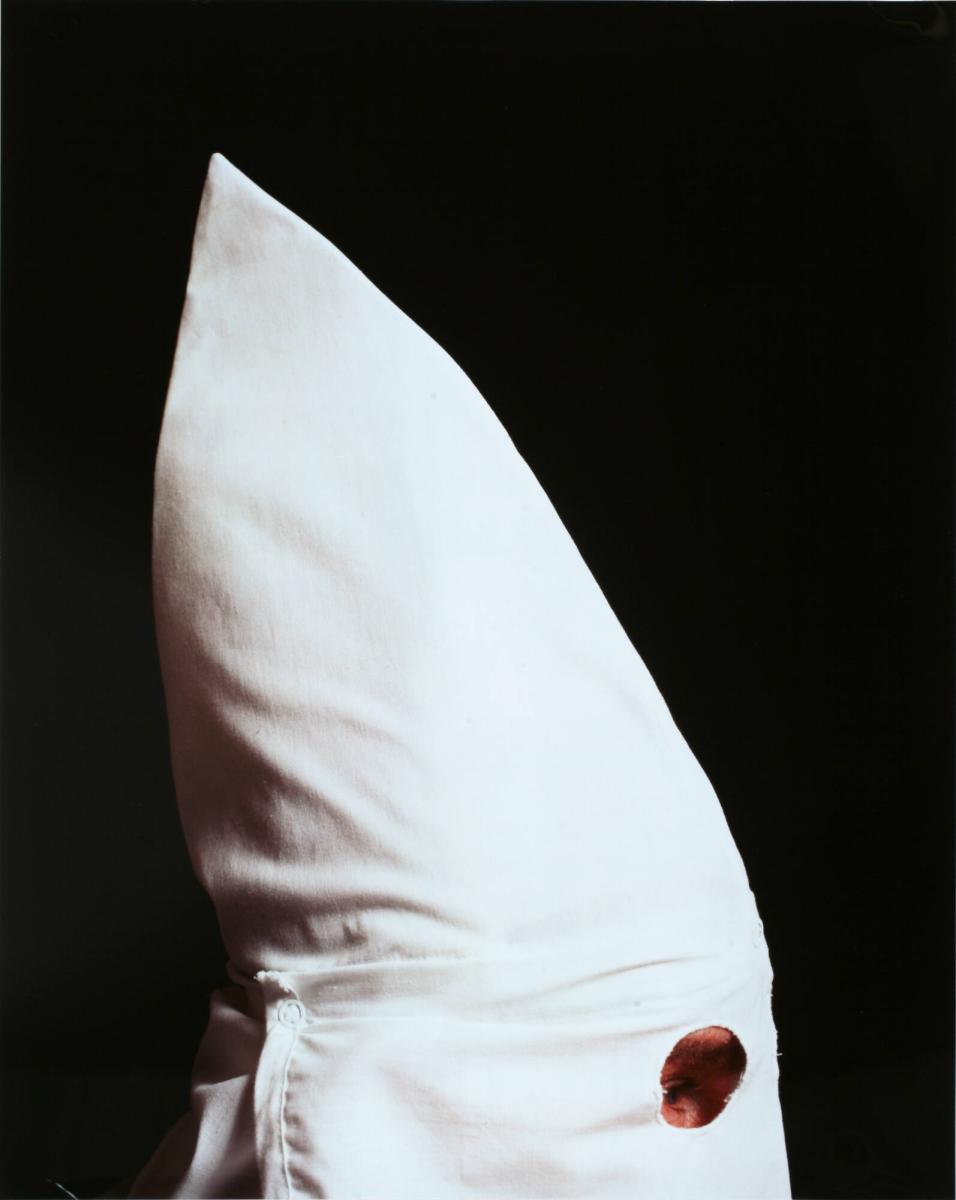 Not on viewKlansman (Knighthawk of Georgia, V)/ stems from a 1990 series of portraits of Ku Klux Klan members. Although the sitter is identified by his codename in the title of each photograph, an iconic hood protects his anonymity. In this image, a Klansman is presented in profile, his white hood isolated against a black background. Although Serrano’s choice of subject seems unorthodox, especially given the artist’s African heritage, his formalizing approach serves to dehumanize and abstract the politically charged sitter.