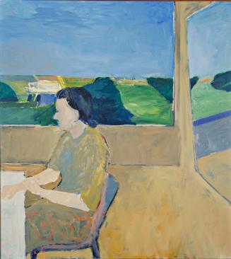 The vibrant blue sky and expansive countryside of Woman by a Large Window are brought indoors, where a woman sits at a table with her back turned to a mirror that reflects the glowing abstract landscape beyond. The artist was careful to remove any details of her face or clothing that might express the sitter's personality. Like the luminous but generalized landscape beyond and behind her, she becomes an axis on the carefully composed grid that underlies Diebenkorn's construction of space. There is no action in this quiet painting-except for that which lays bare the painting process: the rich, almost tapestry-like quality of the woman's dress and the muted interior setting are alive with energetic brushstrokes, scratches, and paint splatters that are often visible in multiple layers of colors and tones.