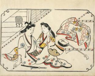A courtesan and young man, or wakashū, are depicted leaning toward each other in a relaxed, intimate fashion, the young man’s robe tossed casually on the floor behind them. He has removed his sword, and it lies near him. Similarly, she has finished playing her shamisen, and it lies with the robe. This is one of the first in a series of approximately fourteen prints that portray a sequential narrative. The imagery becomes more and more erotic as the series progresses. This type of subject was known at the time as “pillow pictures” (makura-e), “dangerous pictures” (abuna-e), and even “giggling pictures” (warai-e).