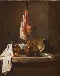Still Life with a Rib of Beef displays a glazed stoneware jug with lid and a pot with a ladle or skimmer, accompanied by a copper cauldron, white cloth, and onions and leeks on a stone ledge, with a joint of meat hanging above-emblematic elements of Chardin's production in the 1730s. These objects were used and reused by the artist in numerous works, often with subtle variations, and are a testament to his careful observation of ordinary utensils and foods. Rendering the varying textures of each individual object obviously appealed to Chardin, and his painted surfaces are often thick and without glazes. He painted slowly and deliberately, with small strokes of colors applied side by side as opposed to being mixed together. The tones come together in the viewer's eye, and even his colored shadows seem to vibrate with light and atmosphere. Modest in both size and subject, Chardin's paintings and the objects they depict speak for themselves, proclaiming not grandiosity but rather a solid, middle-class order and harmony.