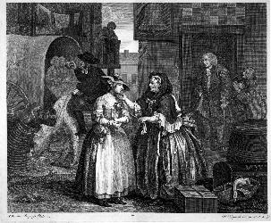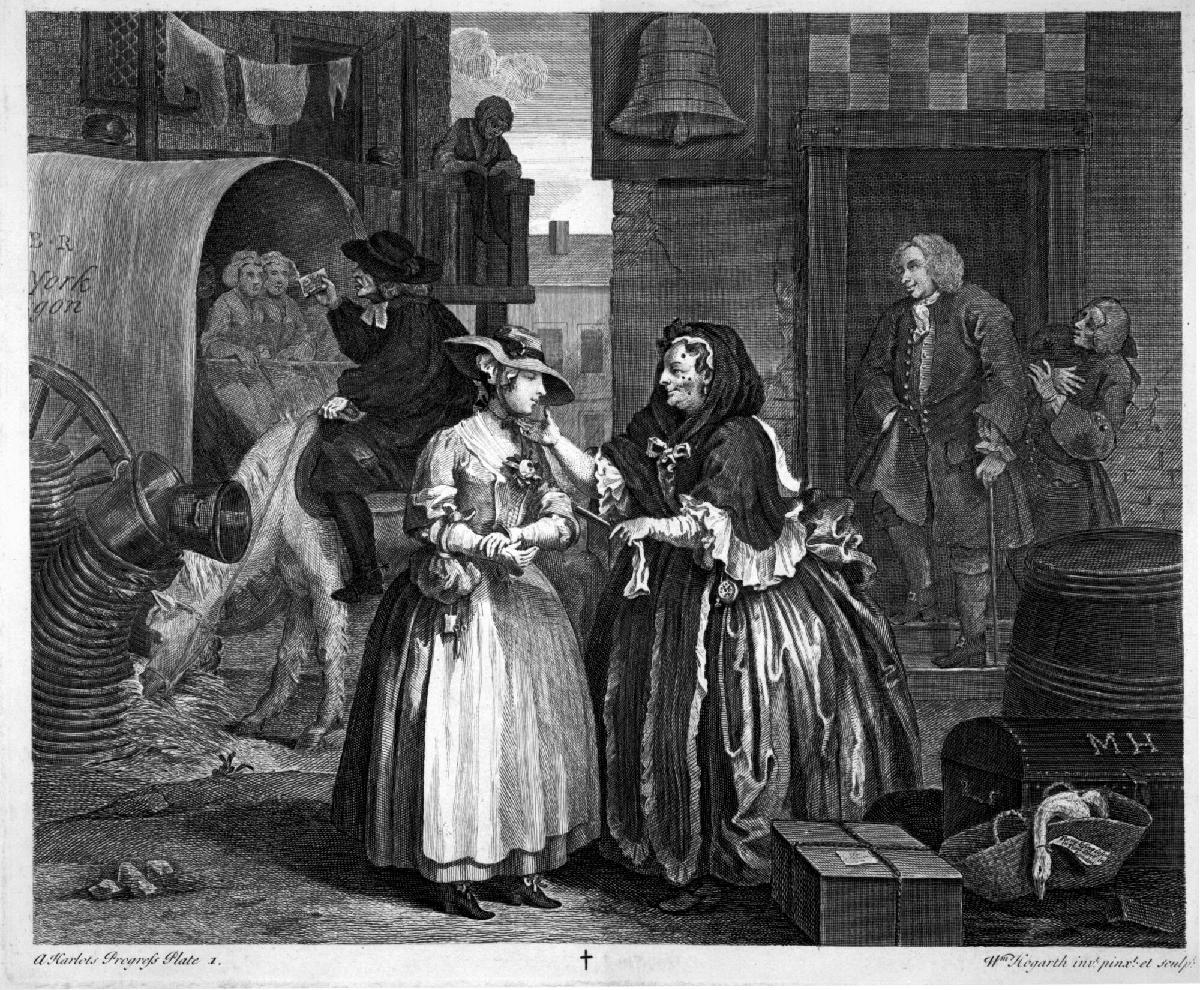 In this first scene, we are introduced to the main protagonist, Moll Hackabout, who—fresh from the countryside—has just arrived at London’s Bell Inn. Moll has come to London to seek employment as a seamstress or domestic servant. Moll’s plans are, however, diverted by the notorious procuress Elizabeth “Mother” Needham.