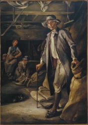 Not on viewThis stark, somber view of the interior of a mill is typical of the unsentimental depictions of country folk that became popular in England in the early 19th century. Such paintings lauded the noble simplicity of rural life while acknowledging the harsh poverty of this type of existence. Barker of Bath’s depictions of laborers occupy a key position in English art: they echo earlier bucolic views of country life by such artists as Thomas Gainsborough and George Morland, and are precursors of the more realistic, less idealized depiction of rural workers in the works of John Constable and William Holman Hunt. The artist received his early training, copying of old master paintings, through the patronage of a local Bath coach builder. He studied in Italy in the early 1790s and became an expert in the fresco technique; in this capacity he advised on the redecoration of England’s Houses of Parliament in 1841.