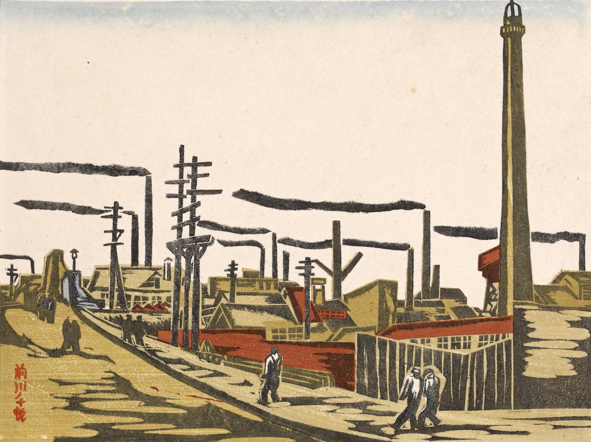 Not on viewThis print captures the busy skyline of early Honjo, then one of Tokyo’s most industrialized neighborhoods. The area’s factories made Honjo an important target for American firebombing at the end of World War II, and the neighborhood was among those most heavily damaged by the 1945 Bombing of Tokyo. This print was created by Maekawa for a portfolio called Scenes of Last Tokyo, capturing views of the city that had been lost in the bombing. This print looks back nostalgically at Honjo’s trailing smokestacks, capturing an industrial scene that no longer existed in a bomb-ravaged Tokyo.