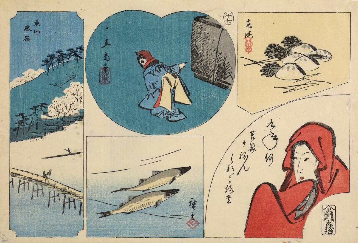 Clams, Fish, Tongue-cut Sparrow, Female Bodhidharma and View of Arashiyama in Kyoto, from an untitled series of harimaze, or assemblage prints