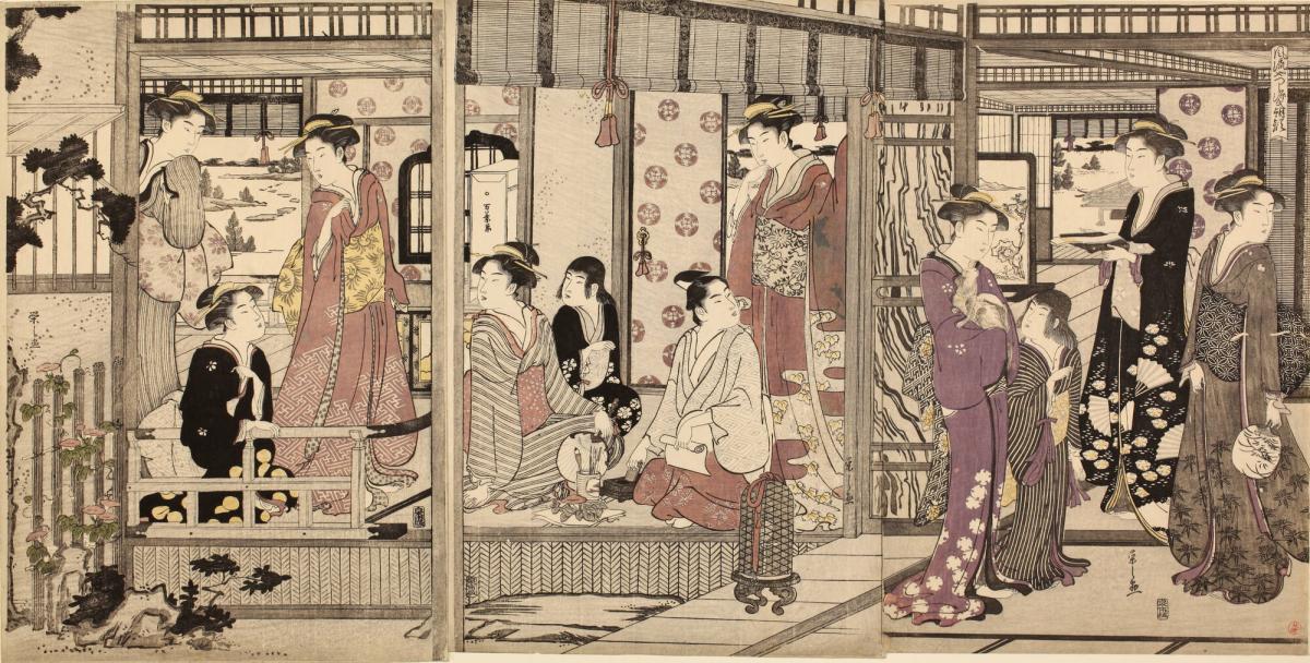 Here, the reference is to Chapter 20 in the 11th-century novel The Tale of Genji, titled Asagao, or "Morning Glories." In it, Genji pursues the lovely but resistant princess Asagao. Seeing withered morning glory blossoms one morning, he sends them to her as a symbol of their relationship: once vibrant in their youth but now faded, with Genji hoping to revive it. In this three-sheet print, or triptych, the figures are all in stylish, late 18th-century contemporary dress, but visual clues to the subject are seen in morning glories that appear at the lower left, and a morning glory pattern on the screen behind the figures. A key reference to the chapter is the young man seated at the center, representing Genji. He holds a rolled-up sheet of paper and is making ink on a black inkstone, preparing to write a poem to accompany the morning glory on the sheet in front of him. He seems to be calling over to the pageboy on the right, who looks back, to deliver it.