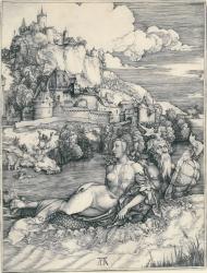 Not on viewDürer titled this print himself, but the exact narrative depicted remains unclear. Judging from the hysterical gesturing of the figure on the shore, the woman appears to have been carried off by an elderly but virile triton. The abduction of women by water-gods is one of the oldest subjects in mythology and the arts, but the woman’s calmness in this print contradicts traditional representations and does not correlate with any single literary or visual source. Instead, Dürer has created an original interpretation, one that employs hyper-realistic detail in the landscape and the figures’ appearances to create a believable, but entirely fictional, account of a familiar subject.