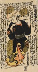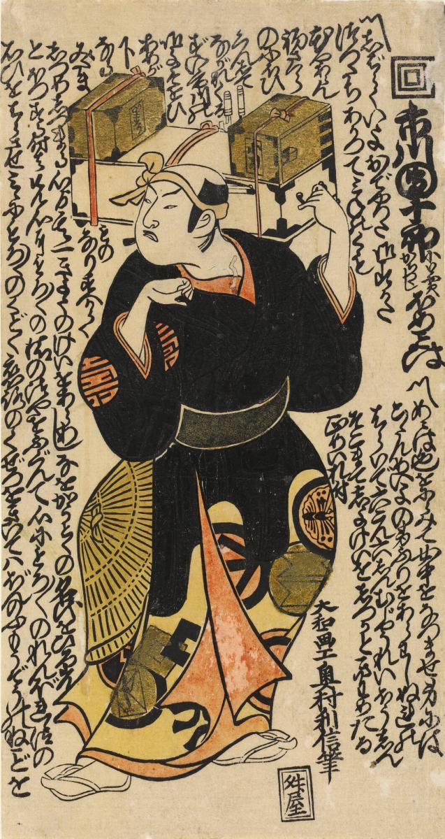 In this interesting print, the peddler is played by the famous actor Ichikawa Danjūrō II (1688–1757), who is identified by the large characters and the Ichikawa crest on the right. The text that fills the empty space around him is part of his long monologue from a play. Curiously, his robe displays the crests of multiple actors, thought to be those of the actors who performed with him. Although the play is not named, it is possible to deduce the date of the print based on information about the actors and when they could have played together in one theater. The two possible plays are Tossaka no jō tsuru no sugomori, performed at the Nakamuraza theater during the eleventh month of 1721, or Ōkamado akinai Soga, performed during the first month of 1722.