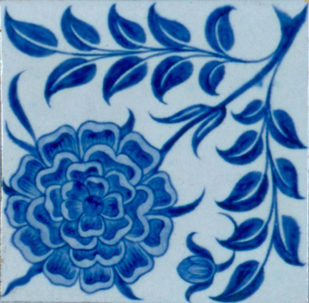 Hand-painted Pottery Tile with Single Blue Rose Flower and Foliage