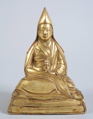 On viewOften misunderstood as referring to any Tibetan Buddhist monk, the term lama means “teacher,” and was traditionally reserved for high-ranking masters or leaders of monasteries. The lama's distinctive hat identifies him as a member of the Gelug (dge lugs) order, one of the four main branches of Tibetan Buddhism. The popular name for this group, the Yellow-hat school, refers to the hat seen here, a yellow, pointed hats Gelug lamas wear in certain ritual contexts. This monastic order was the dominant religious and political power in Tibet from the 16th to the 20th centuries. The long life vase that he holds may indicate that the sculpture is a portrait of the Fifth Dalai Lama, Ngawang Lobsang Gyatso (1617–1682).