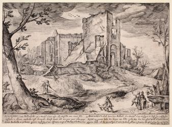 A Dutch draftsman and painter, Goltzius traveled to Italy in 1590, just before the first wave of so-called Dutch Italianates. His naturalistic depictions of Rome's antiquities and views became important records of how the city and its artistic monuments appeared in the late sixteenth century. The ruins of Brederode Castle near Haarlem were an inspiration for numerous Dutch artists in the seventeenth century. The depiction of Brederode Castle was one of Goltzius's few landscapes drawn from reality in the Netherlands, in the tradition of his precisely drawn Italian sketches. Gauw took Goltzius's 1600 drawing of Brederode Castle and turned it into an etching with the addition of trees, other structures, and figures of tourists and workers.